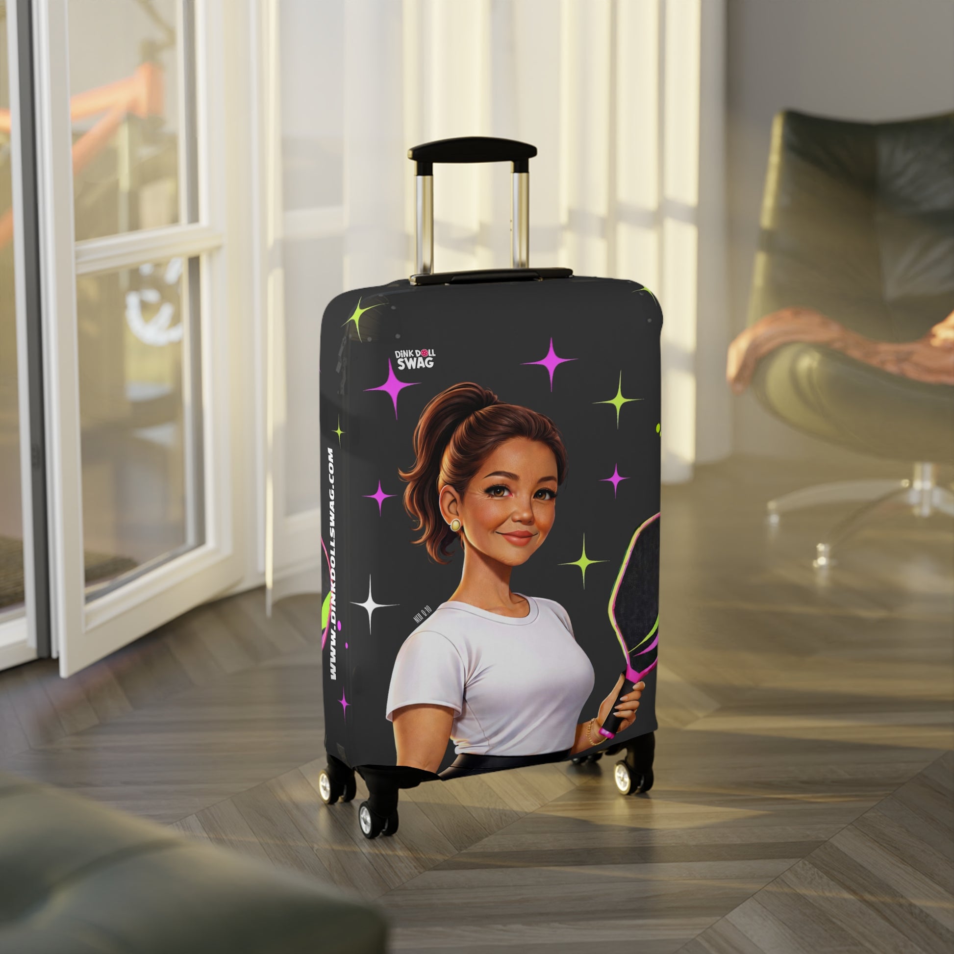 The Dink Doll Swag™ Joy in Motion – Legacy Series Luggage Cover – Elena Edition is designed for the woman whose confidence is steady and whose strength is unmistakable. Featuring a refined Dink Doll illustration with polished styling, composed posture, and calm athletic presence, Elena represents assurance shaped by experience and joy carried with grace.