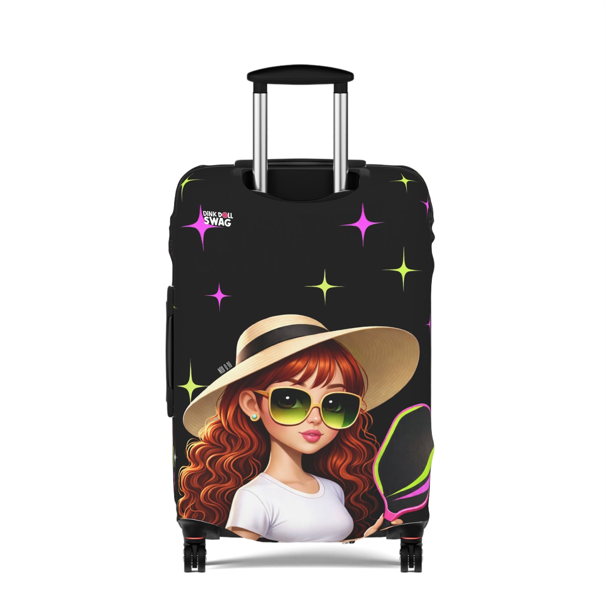 The Dink Doll Swag™ Joy in Motion Luggage Cover – Sienna Edition is designed for the woman who shows up fully and plays with heart. Featuring a striking Dink Doll illustration with flowing curls, radiant energy, and fearless court style, Sienna represents confidence that’s expressive, joyful, and impossible to miss.